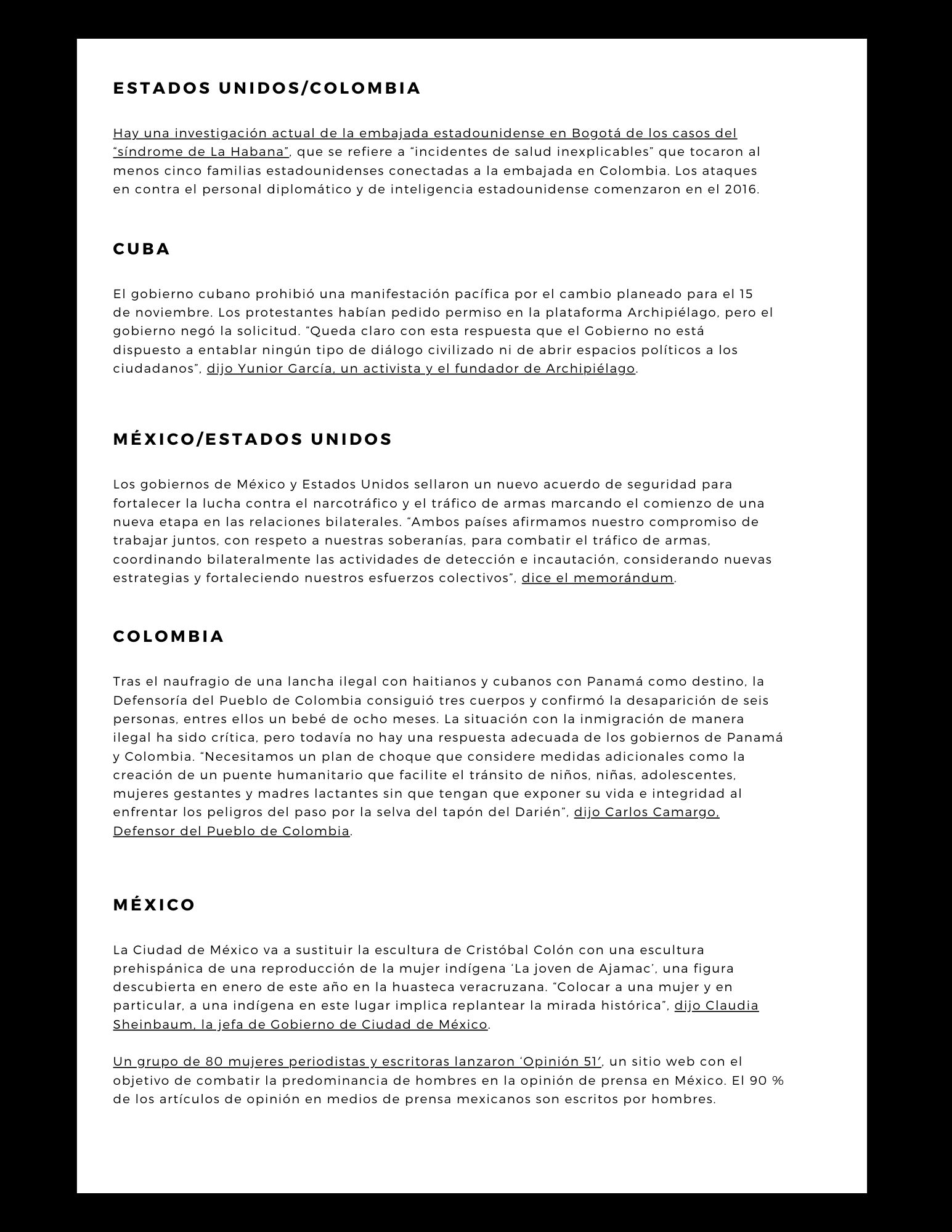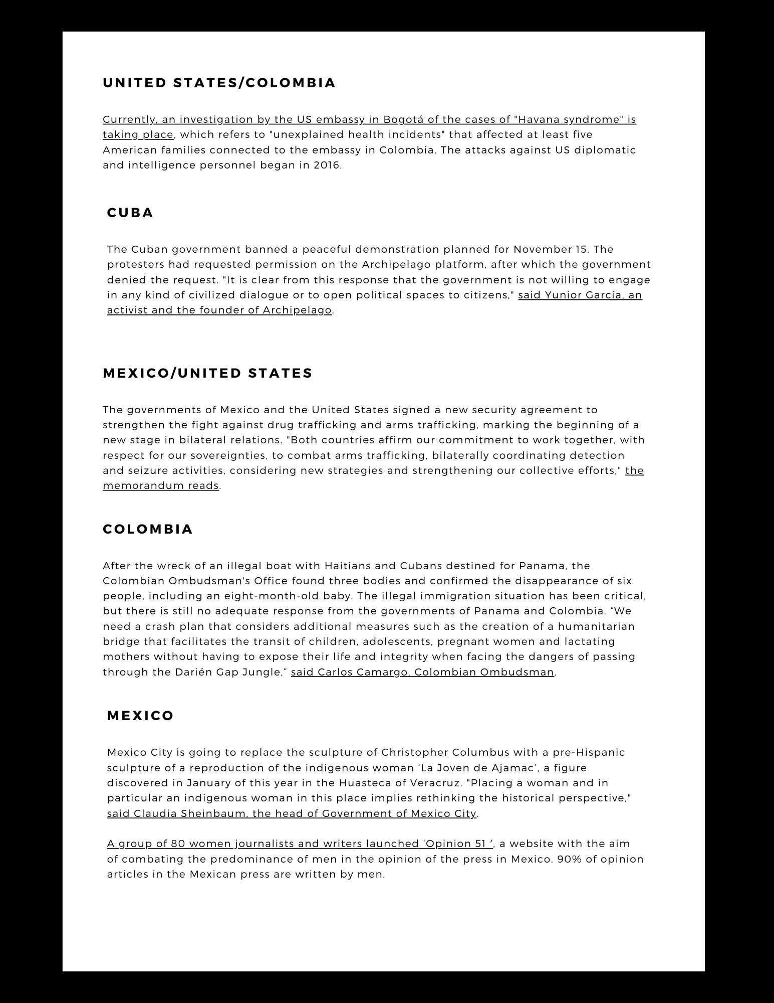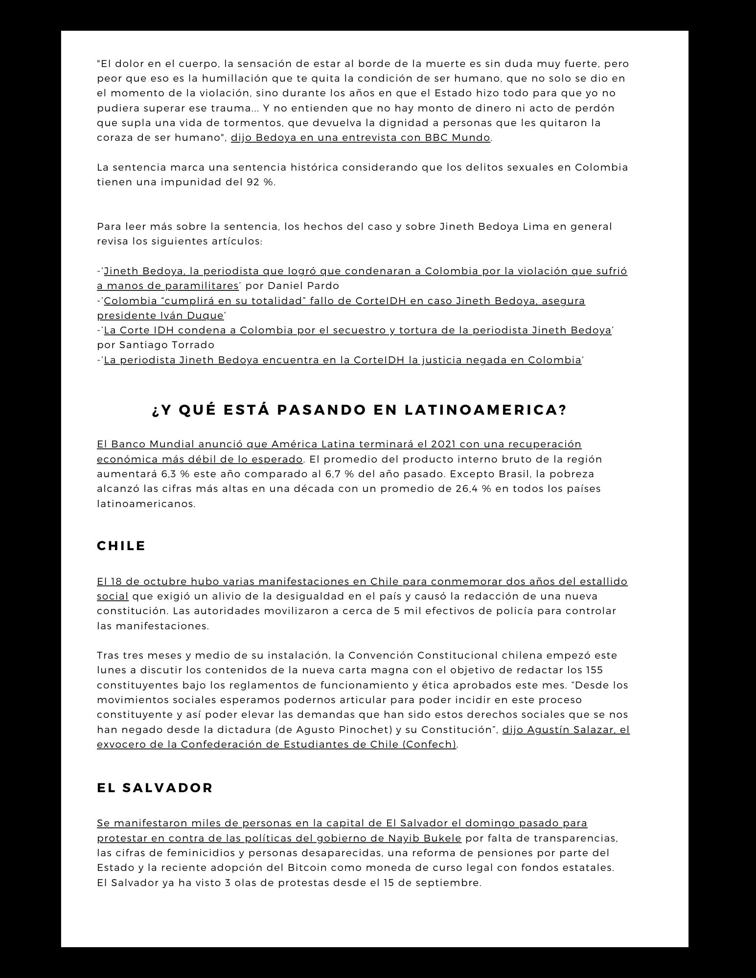 Edición 10/19/21 Posted bySusanne SchweitzerOctober 19, 2021October 19, 2021Posted inWeekly NewsletterTags:América Latina, boletín, Colombia, CorteIDH, defensora de derechos humanos, Diarios LatAm, El caso de Jineth Bedoya, La Corte Interamericana de Derechos Humanos, Latin America, Latinoamérica, Noticias, periodismo, periodista, Venezuela, violence against women, Violencia de género, Weekly Newsletter Join my Mailchimp audienceSubmitting form By clicking submit, you agree to share your email address with the site owner and Mailchimp to receive marketing, updates, and other emails from the site owner. Use the unsubscribe link in those emails to opt out at any time. Processing… Success! You're on the list. Whoops! There was an error and we couldn't process your subscription. Please reload the page and try again. Share this: Click to share on X (Opens in new window) X Click to share on Facebook (Opens in new window) Facebook Like Loading... Related